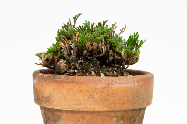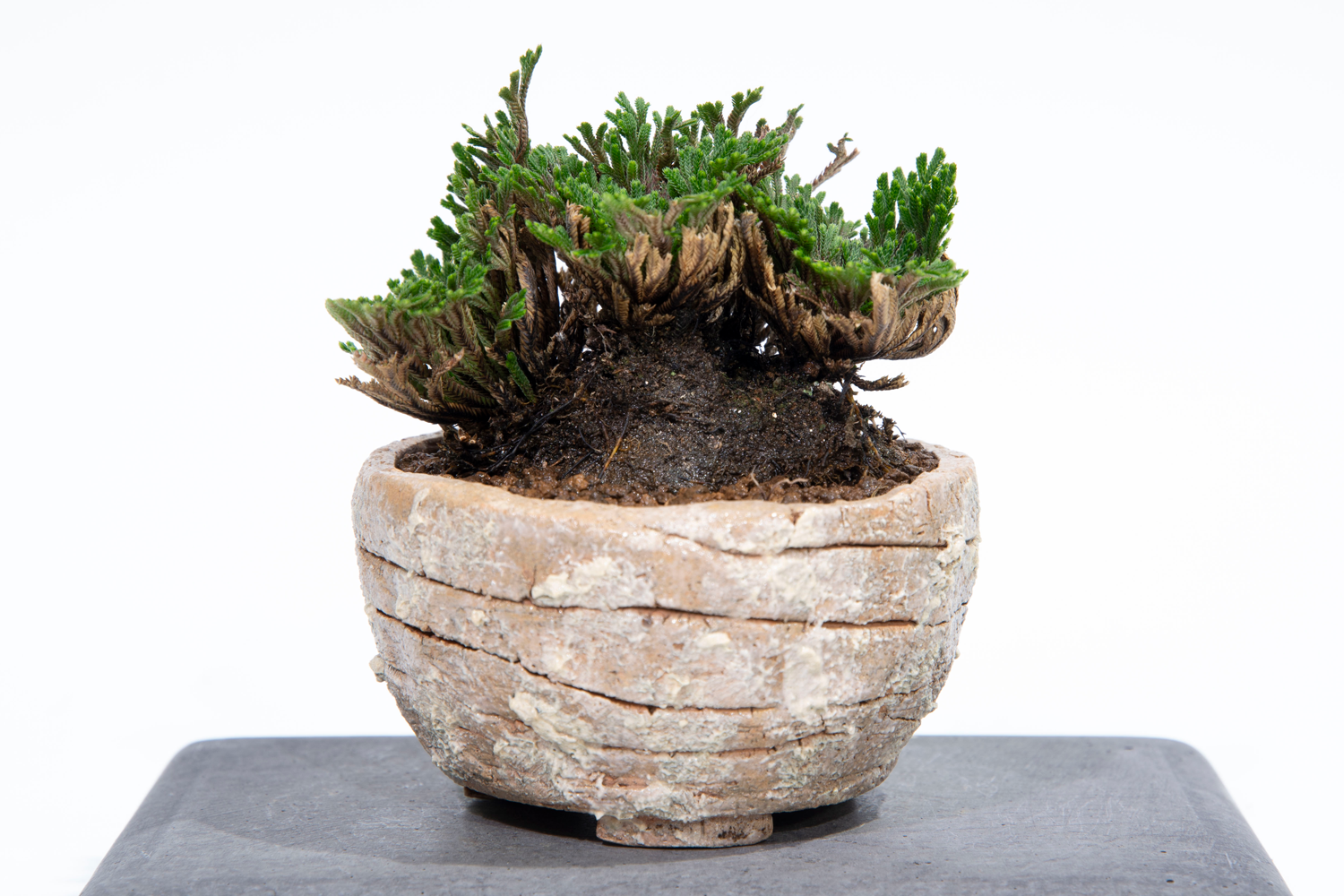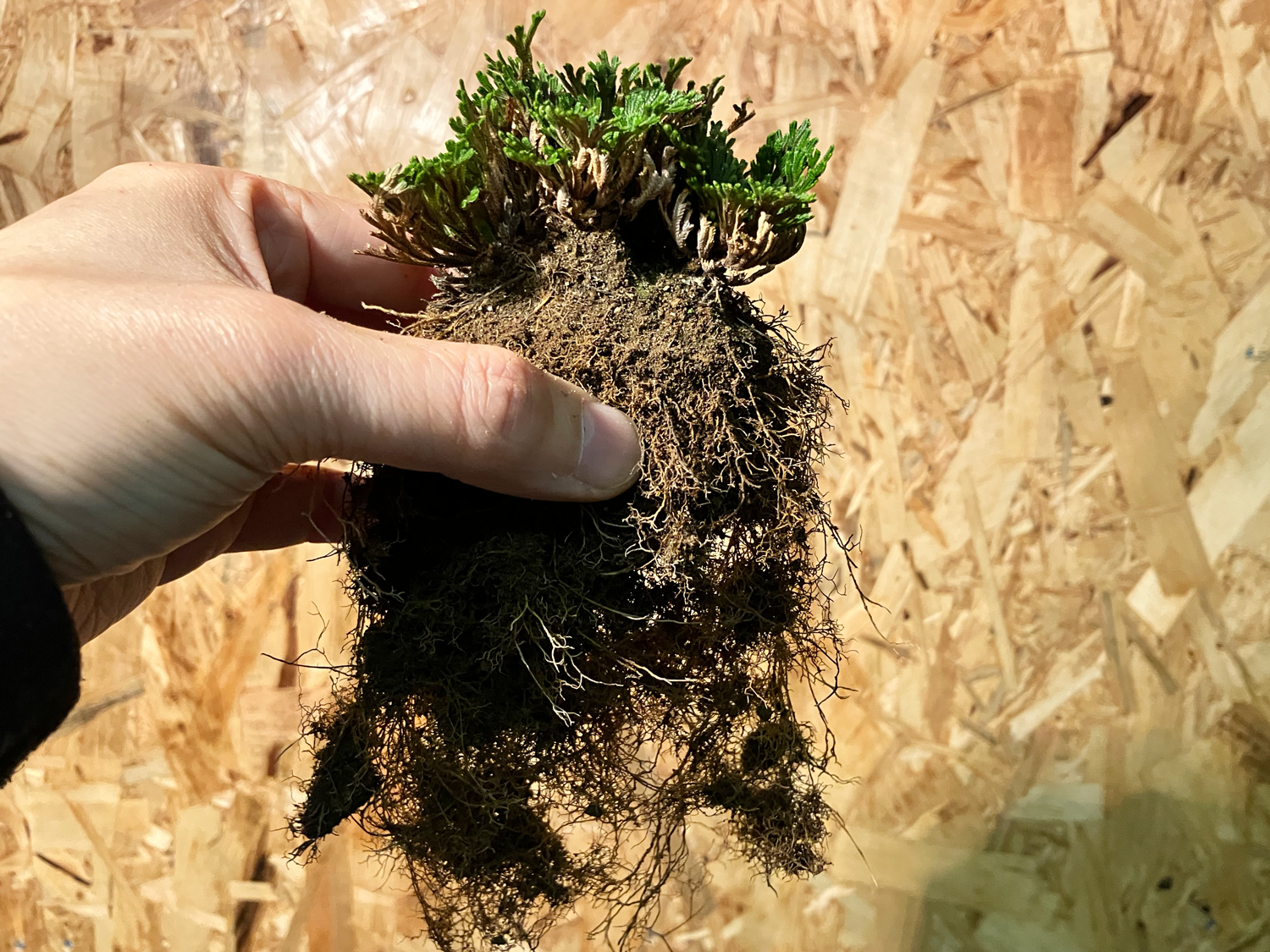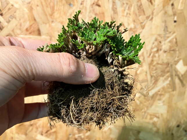 イワヒバの植え替え 2026-04-07 / K / コメントする 埼玉県花植木流通センターで購入したイワヒバです。 かなり土が潰れていたので、植え替えをすることにしました。 せっかくなので、自作の鉢に入れようかなと思います。 根はとっても元気そう。鉢の中がパンパンでした。 盆栽博士(Gemini)に聞いたところ、イワヒバはあまり根を切らない方がよいと言ってたんですけど、これくらいは切らないと、流石に鉢に入りませんでした(^^;) なんか微妙な鉢(要は失敗作w)ですが、350円のイワヒバを入れるには十分でしょう。 メモ 土は瓦印の赤玉。 マグァンプ投入。