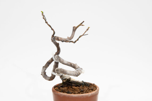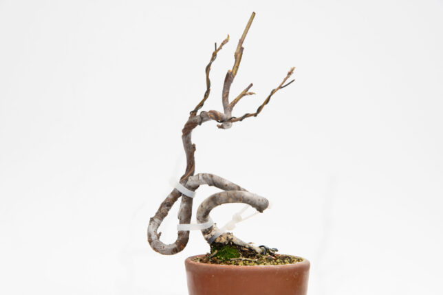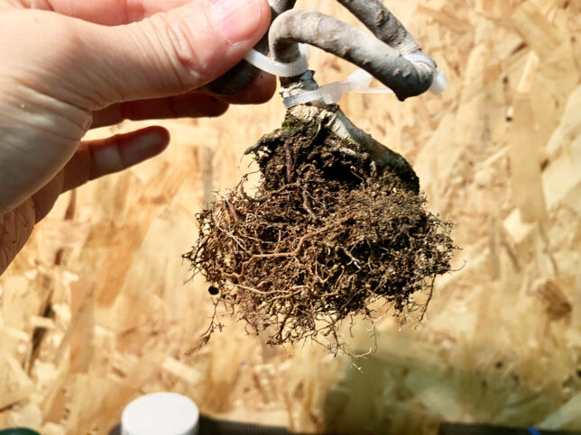 カイドウだかズミだかの植え替え 2026-02-21 / K / コメントする 近所の盆栽園で購入した、ズミだかカイドウだかの素材を植え替えました。 根はよく出ていたので、1/3くらい切り詰めた。 植え付け角度は、ほとんど変わってないですね。 頭が後ろに逃げてるのでどうしたらいいかAIに聞いたら、「左の枝を頭にして、それ以外は切って、左流れで作れ」とのこと。流石にいきなりそれはしんどいので、太い枝だけ切り詰めておきました。 切り口にはトップジンMを塗布。 流れの話は、とりあえず保留で(^^;)