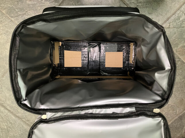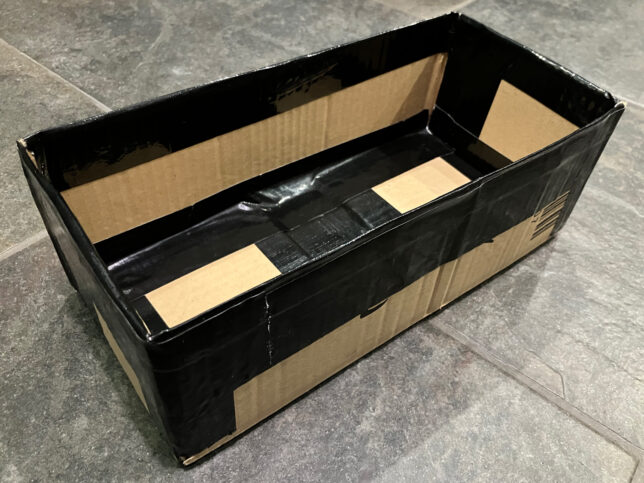でも、底に安定感が無さそうだったので、リュックの底と同サイズの段ボール箱を作り、底に敷きました。